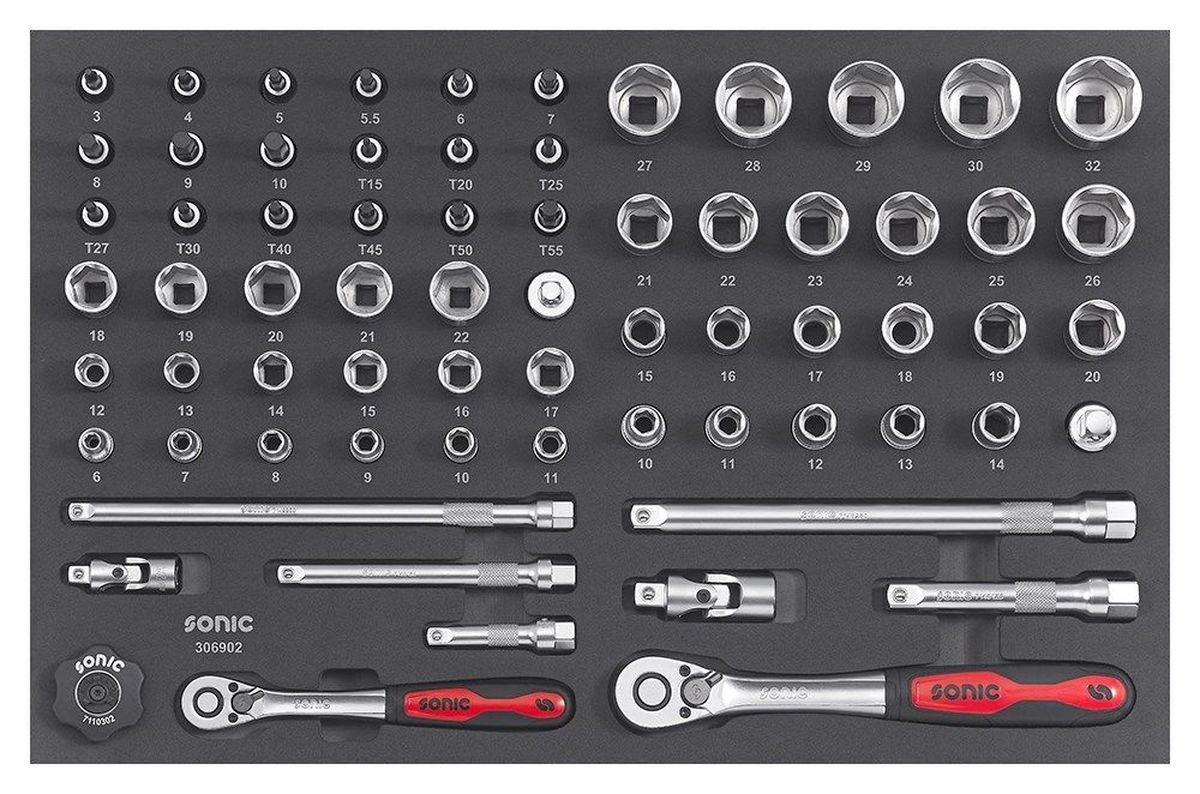 Goed gereedschap is belangrijk bij het klussen en deze veilig en goed opbergen is net zo belangrijk. Met deze Sonic Next S8 haal je een hoogwaardige gereedschapswagen in huis die is voorzien van een 197-delig gereedschap. Hieronder bevinden zich diverse sleutels, doppen, hamers, tangen, beitels en nog veel meer in verschillende soort en maten. Allemaal handig en overzichtelijk opgeborgen in flexibele en stevige inlays die zijn verdeeld over de laden. De gereedschapswagen is compact en makkelijk te verplaatsen door de vier heavy duty zwenkwielen, waarvan er twee voorzien zijn van een rem, Het afneembare bovenblad is gemaakt van RVS en de wagen is voorzien van een spuitbus- en papierrolhouder.