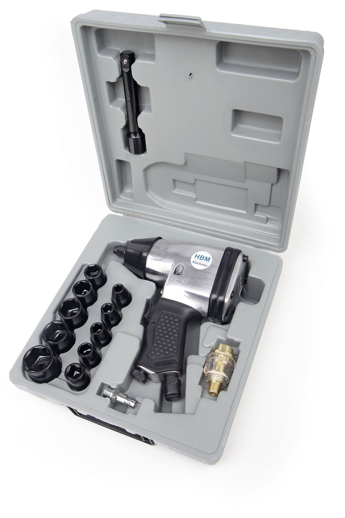 De HBM 17 Delige 1/2 inch Slagmoersleutelsetslagmoersleutel van zware kwaliteit en heeft een verstelbaar koppel tot 340 Nm. Dankzij de Links / Rechts schakeling werk je extra makkelijk met de set en de slagmoersleutel is voorzien van softgrip. De HBM 17 Delige 1/2 inch Slagmoersleutel heeft een gewicht van 2200 gram en een maximale NM van 340. De machine is eenvoudig en snel aan te sluiten op een compressor slang. Met de tool maak je binnen no-time een moer los of maakt deze los. Over de HBM 17 Delige 1/2 inch Slagmoersleutelset Deze HBM 17 Delige 1/2 inch Slagmoersleutelset wordt standaard geleverd inclusief een tiendelige krachtdoppenset. Deze set bestaat uit krachtdoppen van 9 – 10 – 11 – 13 – 14 – 17 – 19 – 22 – 24 en 27 millimeter. Daarnaast ontvang je ook één mannelijke nippel, één olievernevelaar, één 125 mm verlengstuk en het geheel berg je netjes op in de kunststof opbergkoffer. De ideale set dus voor in iedere werkplaats en vakman.