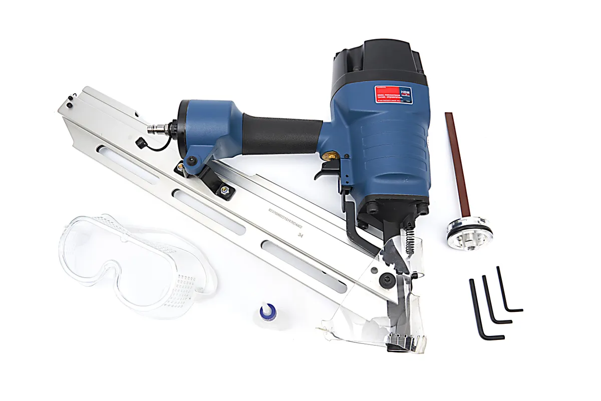 Deze krachtige pneumatisch aangedreven spijkerpistool vuurt eenvoudig 50 tot 90 mm spijkers in een hoek van 34° af. Hiermee is het spijkerpistool geschikt voor tal van klussen. Het apparaat werkt op luchtdruk en kan hiermee eenvoudig nieten of spijkers in dik materiaal schieten. Gebruik het apparaat bijvoorbeeld voor het aanbrengen van isolatiefolies of voor het zorgvuldig aanbrengen van meubelbekleding. Dit zeer krachtige spijkerpistool is zeer eenvoudig in gebruik en gemakkelijk zelf in te stellen. Zo is het apparaat voorzien van een verstelbare penetratiediepte en is het apparaat daarmee ook zeer geschikt voor dak framewerk en bevloeringswerkzaamheden. Het drukpunt van het pistool laat geen markeringen achter, waardoor je het materiaal waarmee je werkt niet onnodig beschadigt. Daarnaast ligt het apparaat zeer comfortabel in de hand dankzij een zacht rubberen handgreep en compacte formaat. Het apparaat komt van pas op elke werkplek en kan zowel door de professionele vakman als door de thuishobbyist gebruikt worden.