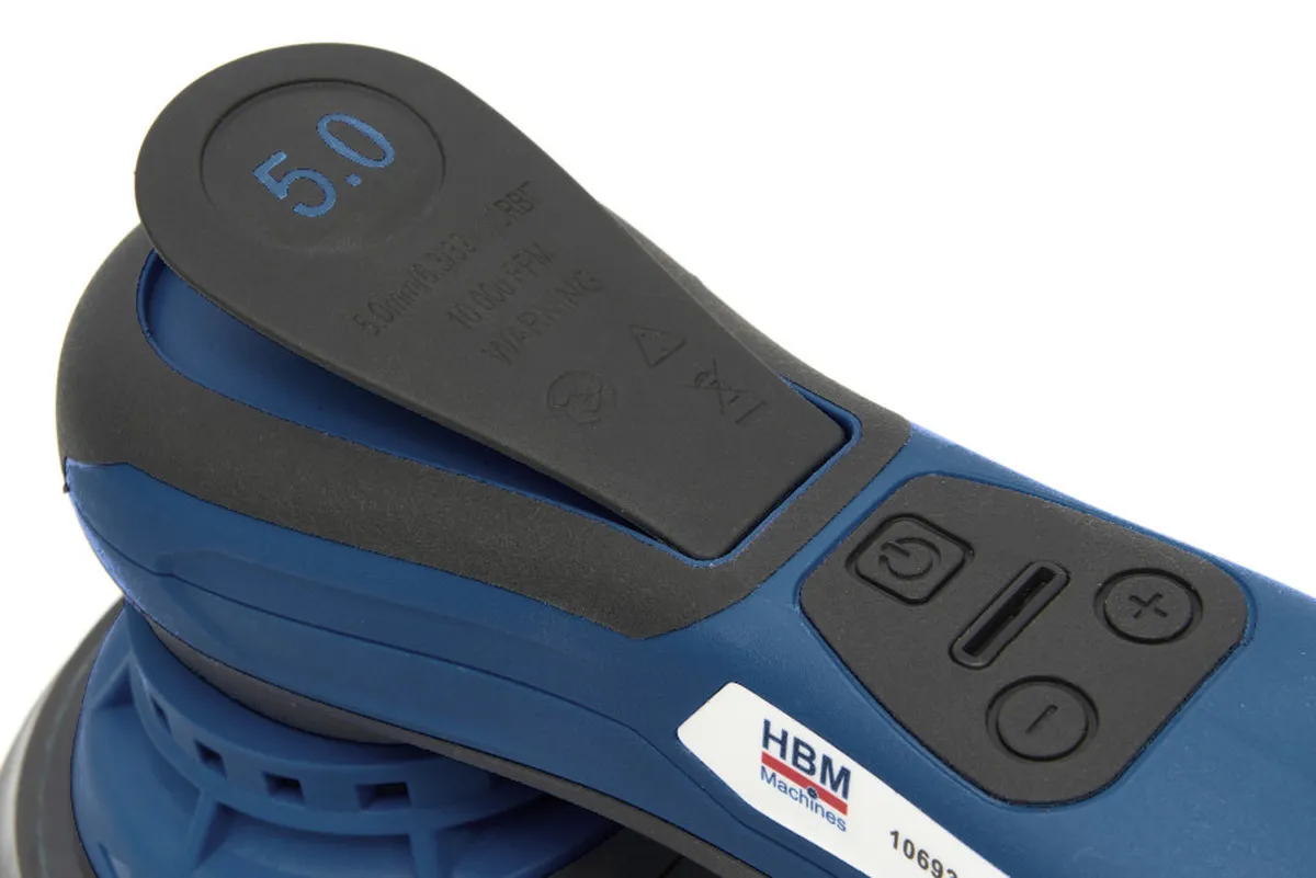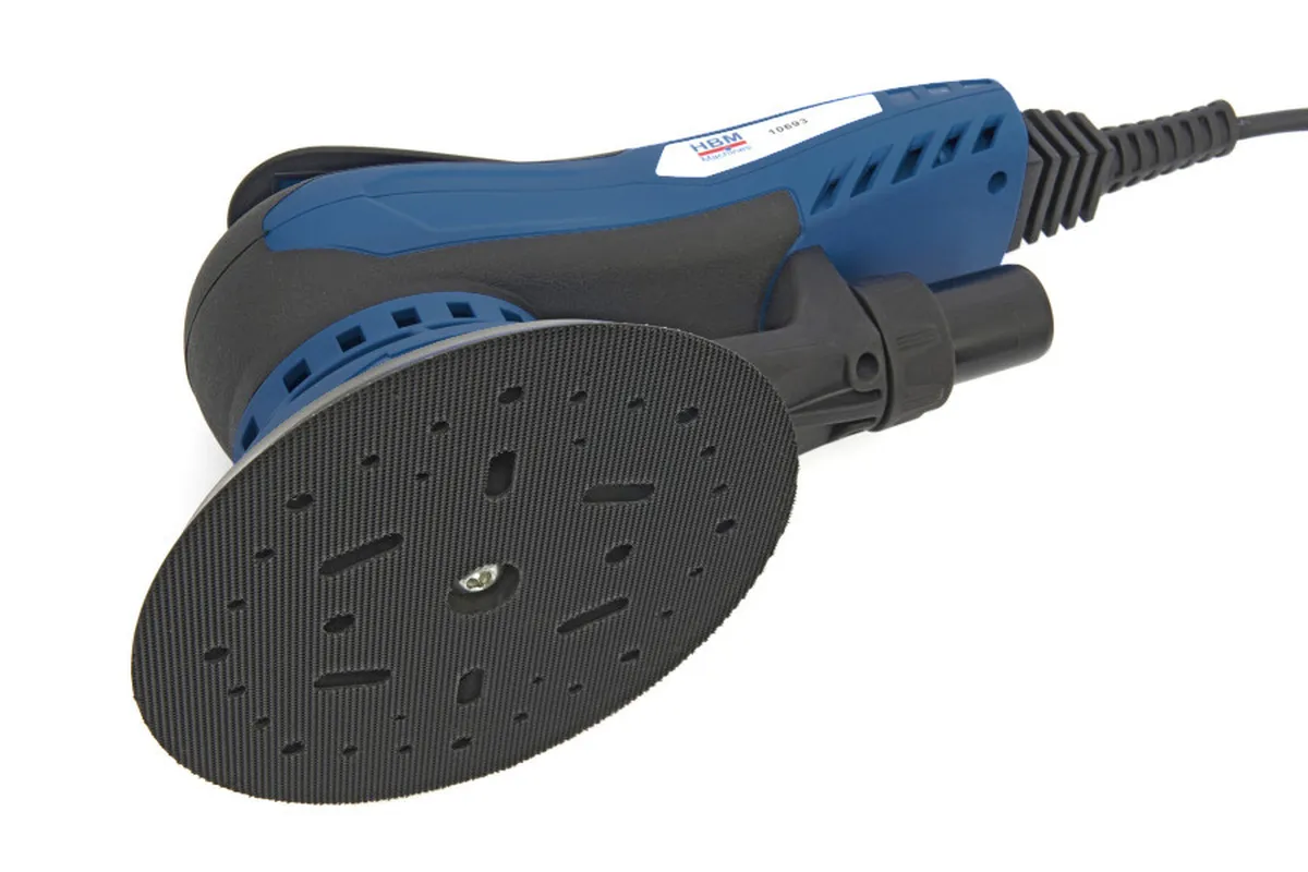 De HBM 350 Watt Excentrische Schuurmachine biedt het comfort van een compacte machine met de kracht en duurzaamheid van een professioneel model. Dankzij de borstelloze motor en elektronische toerentalregeling werk je stil, precies en langdurig. Met de + en – knoppen op het handvat stel je het toerental eenvoudig af. De machine ligt goed in de hand, met één of twee handen te bedienen, en is voorzien van een handpalmvormige dodemansknop voor maximale veiligheid. Stofafzuiging kan passief via de ingebouwde ventilator, of actief met een stofzuiger via de meegeleverde flexibele slang. De schijven worden met klittenband bevestigd en zijn volledig stofdoorlatend – ideaal tegen verstopping. Zowel professionele als standaard schuurschijven passen perfect. De krachtige motor met 5 mm excentriciteit presteert moeiteloos, zelfs bij stevige druk. En zonder koolborstels gaat de motor veel langer mee. Een robuuste machine voor intensief gebruik, nauwkeurige afwerking en optimaal schuurcomfort.