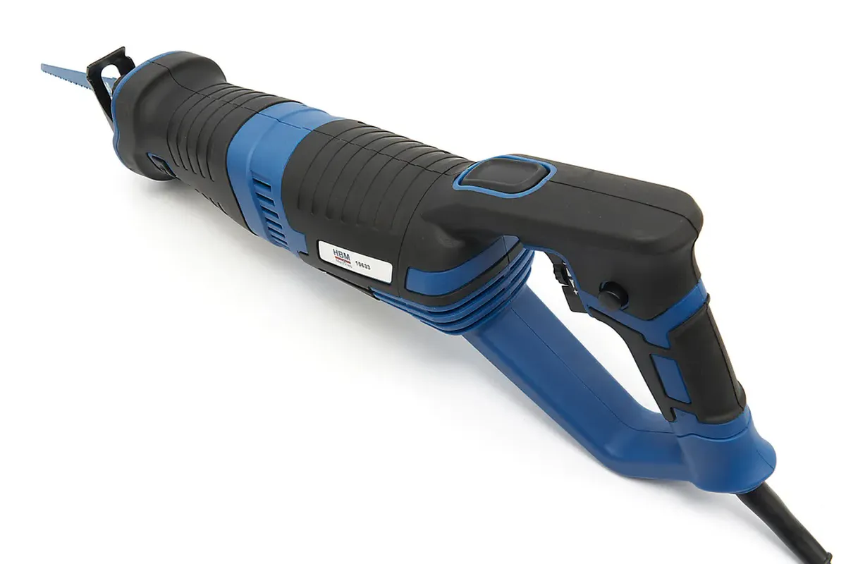 Een reciprozaag is vaak de beste tool voor het afkorten van balken en profielen van alle soorten materiaal in alle denkbare standen. Het is een gereedschap dat bedoeld is om gebruikt te worden op moeilijk te bereiken plekken en gezien kan worden als grote-, doch veelzijdiger broer van een decoupeerzaag, die geschikt is voor veel zwaarder werk dan een decoupeerzaag en toch ook zeer precies gebruikt kan worden. Hierdoor is het een onmisbaar stuk gereedschap voor de houtbouwer, de klusser op locatie, en zeker ook voor de sloper.Met zijn slag van 22 mm maakt deze machine korte metten met hout (tot 150 mm), staal (tot 15 mm) en non ferro metalen (tot 32 mm) in werkelijk iedere stand op iedere plek. Deze HBM reciprozaag heeft als extraatje een handvat dat 90° en -90° dwars gezet (en vergrendeld) kan worden. Hierdoor wordt de machine nog makkelijker inzetbaar op moeilijke plekken en kan je er voor zorgen dat deze sterke elektrische zaagmachine altijd goed kan worden vastgehouden. Het werkstuk wordt verlicht door een powerled, zodat je ook in donkere hoekjes kan zien wat je doet. De kop is voorzien van een snelspankoppeling, dus geen gedoe met sleuteltjes om van zaagblad te wisselen. Tijdens het wisselen van zaagblad kun je op de blokkeringsknop drukken, om de zaag in 1 stand vast te zetten. Dat is handig, maar ook veilig. In de trekker op het handvat bevindt zich een wieltje waarmee het maximale toerental geregeld kan worden bij het volledig indrukken van de trekker. Dat is bedoeld voor die zaagsneden die met grote voorzichtigheid uitgevoerd moeten worden. De HBM reciprozaag met zijn zeer sterke 900 Watt motor, wordt standaard geleverd inclusief 3 verschillende zaagbladen voor metaal, plastic en hout.