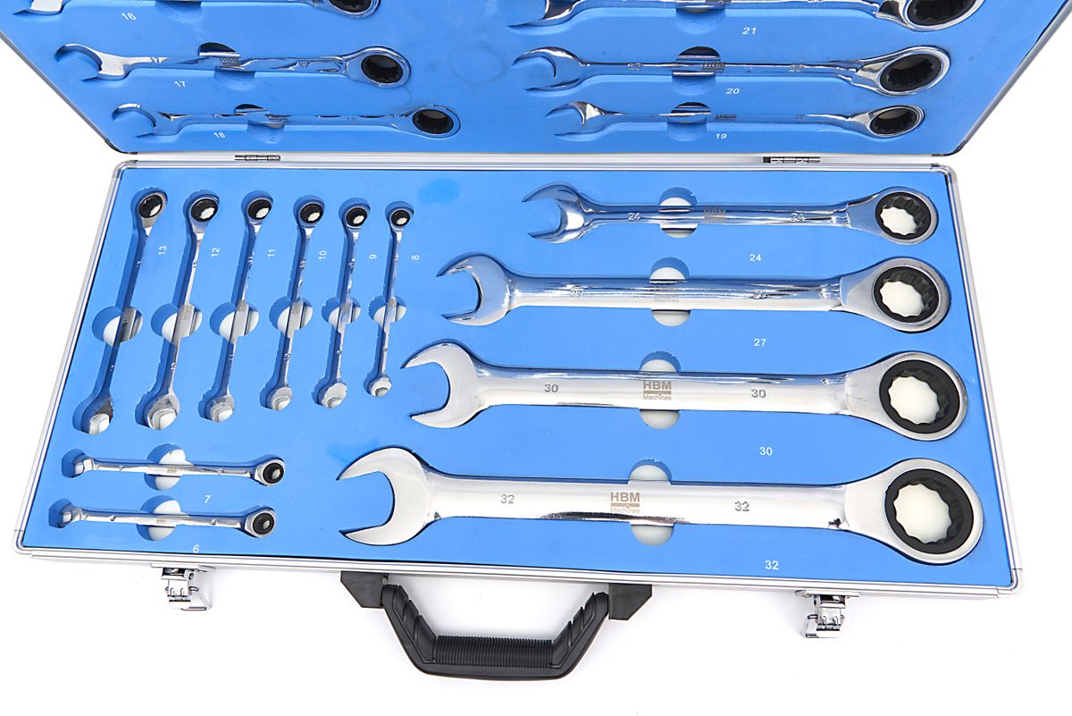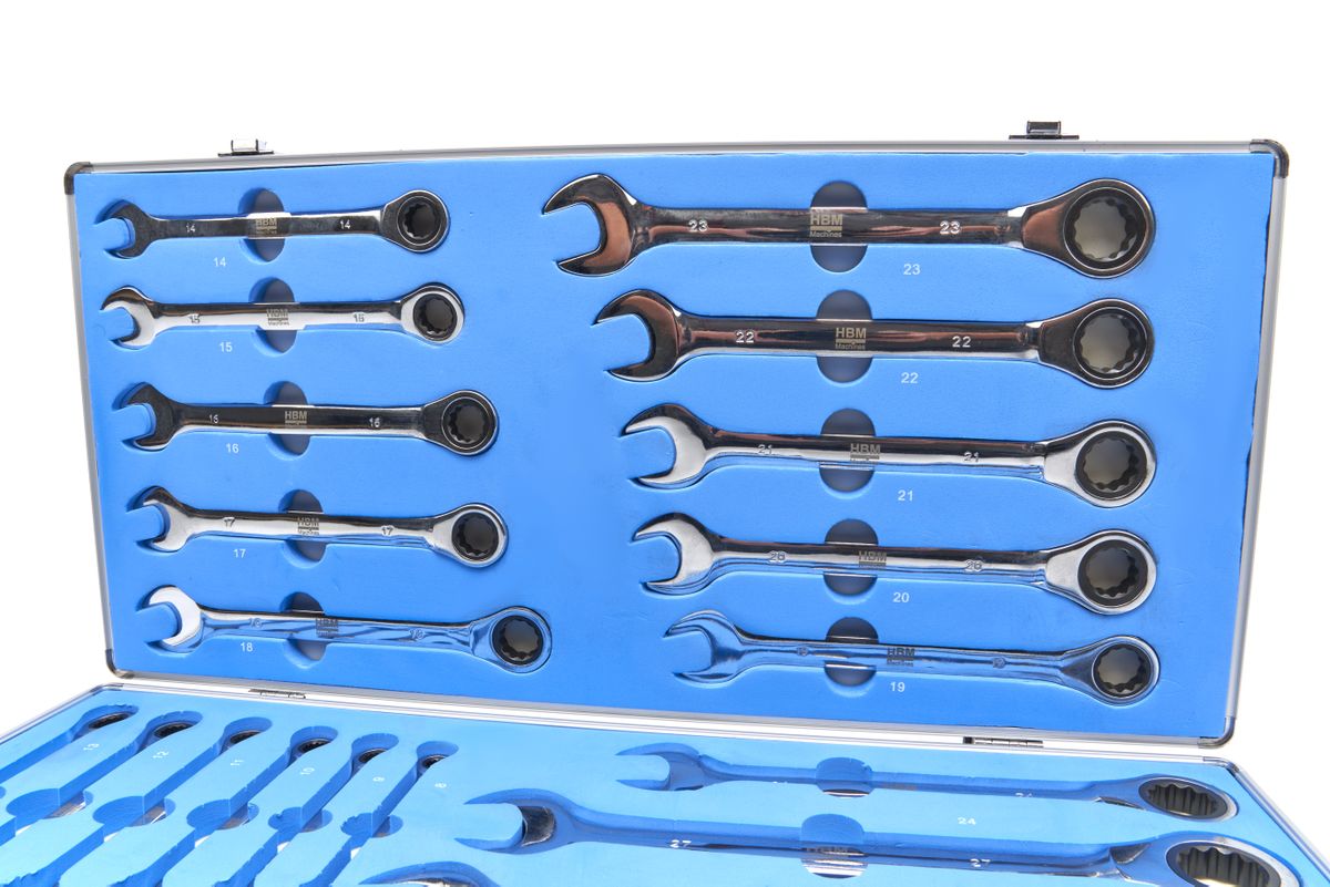 De HBM ring-, ratel- en steeksleutelset bevat 22 sleutels in de maten van 6 tot 32 mm, ideaal voor het uitvoeren van verschillende klussen in de werkplaats of thuis. Deze set biedt veelzijdigheid en gemak, met een uitgebreide reeks sleutels voor het vast- of losdraaien van bouten en moeren in diverse maten. De set wordt geleverd in een stevige opbergkoffer, zodat je alles georganiseerd en binnen handbereik hebt.