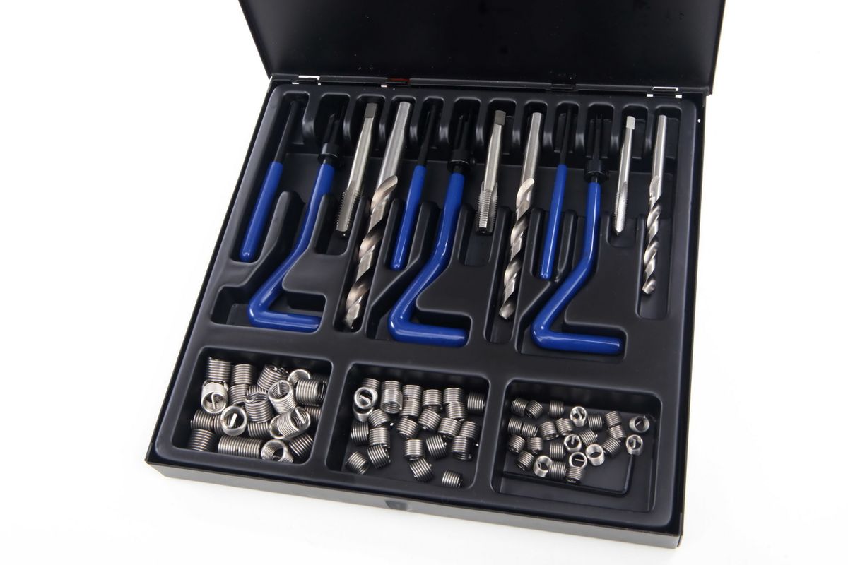 Bevat alle benodigdheden ter reparatie van beschadigd schroefdraad. Boor het gat op met de meegeleverde boor. Tap nieuw schroefdraad in het gat. Monteer een schroefdraadhuls met montagehulpstuk. In de schroefdraadhuls past nu weer de originele bout. Wordt ook gebruikt ter versterking van schroefdraadverbindingen in aluminium. Schroefdraadhulzen ook los leverbaar ter aanvulling van de set.