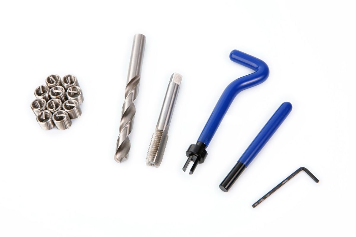 Bevat alle benodigdheden ter reparatie van beschadigd schroefdraad. Boor het gat op met de meegeleverde boor. Tap nieuw schroefdraad in het gat. Monteer een schroefdraadhuls met montagehulpstuk. In de schroefdraadhuls past nu weer de originele bout. Wordt ook gebruikt ter versterking van schroefdraadverbindingen in aluminium. Schroefdraadhulzen ook los leverbaar ter aanvulling van de set. De sets van M 5 tot en met M 10 worden geleverd met 25 RVS Draadbussen. De sets van M 12 tot en met M 14 worden geleverd met 10 RVS Draadbussen. De set van M 16 wordt geleverd met 5 RVS Draadbussen. LET OP !! De set van M 16 wordt geleverd ZONDER boor.