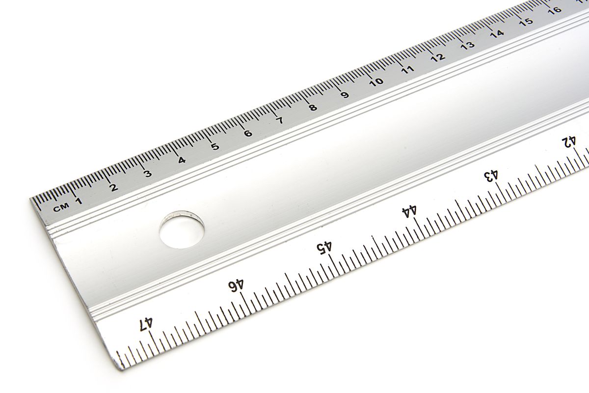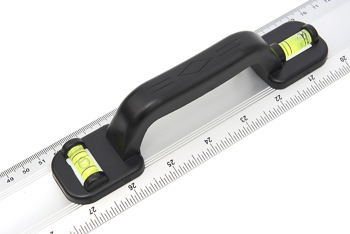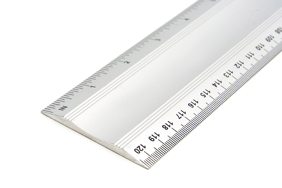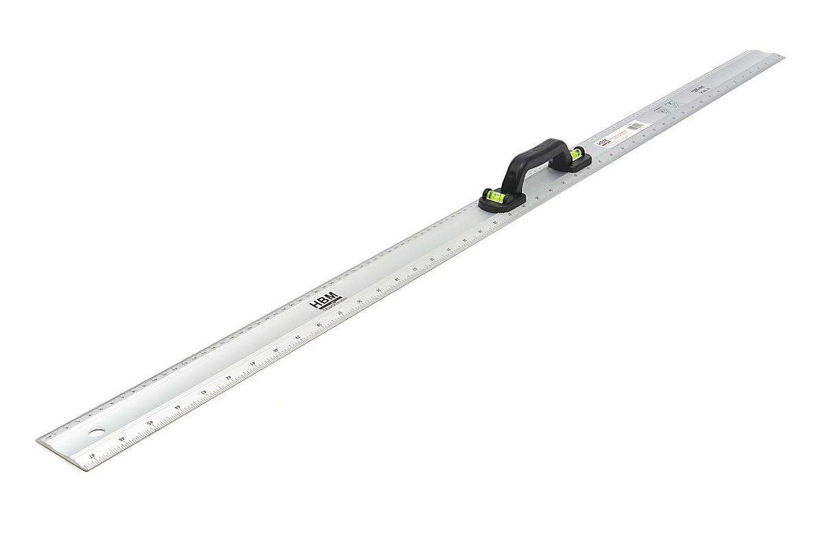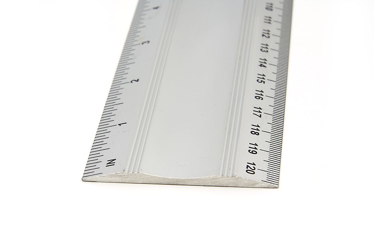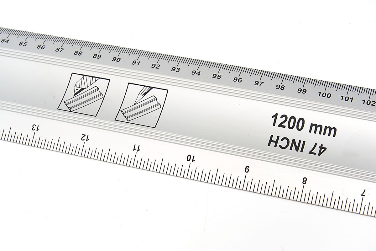 Afgeschuinde liniaal uit aluminium met ingelaten snij- en markeerranden en duidelijke metrische en imperiale schaalverdeling. Gemakkelijk op te bergen dankzij het hanggat.