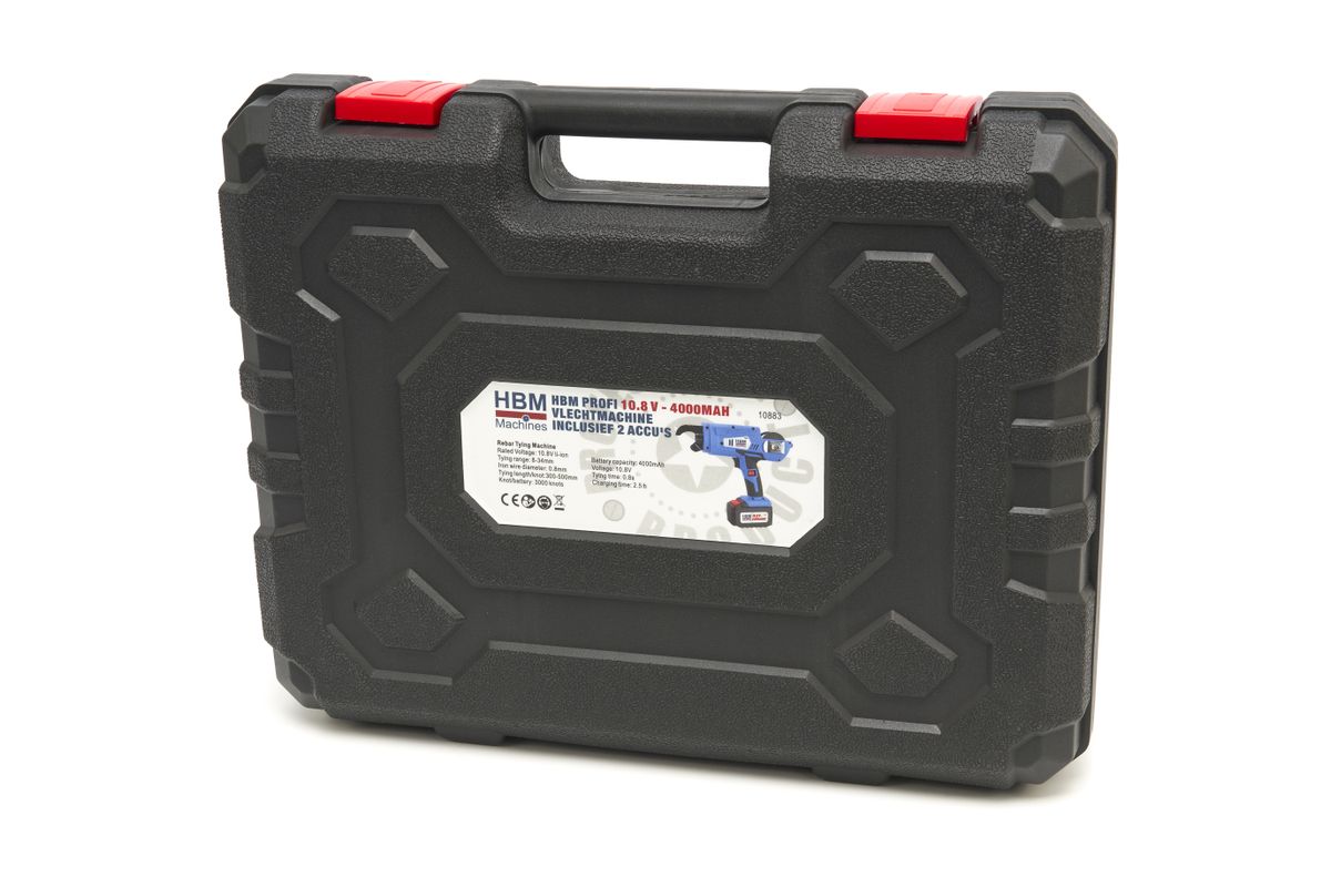 Bij het onderling vastzetten van betonijzermatten wordt meestal gebruik gemaakt van vlechtdraad dat met de hand wordt bevestigd aan het ijzer. Bij de bewapening van betonvloeren liggen deze matten vaak enkele centimeters boven de grond (met afstandhouders) en vergt de onderlinge bevestiging vaak veel bukwerk. Omdat het bij beton storten de klok ongenadig is, moeten de voorbereidingen vaak in zeer korte tijd geschieden. Dan is met de hand vlechten vaak een te arbeidsintensieve taak die te lang gaat duren. Daar is deze automatische vlechtmachine voor bedacht! Deze zeer handige draadloze accu vlechtmachine voert in hoog tempo een vlechtdraad door, die tegen een matrijs aan loopt die het draad in een cirkel doet buigen. Door het betonijzer in de bek van de vlechtmachine te houden, wordt het vlechtdraad (in een cirkel) om het betonijzer gewikkeld. Vervolgens wordt het vlechtdraad opgepakt door een tweetal roterende pennen waar het draad in verstrikt raakt. Deze pennen wikkelen (“vlechten”) de draad vervolgens op en zo wordt datgene wat zich in de cirkel bevindt (het betonijzer) samengebonden. De vlechtmachine wordt geleverd met 2 accu’s zodat je altijd verder kunt gaan met je klus. Tot slot knipt deze vlechttang de draad ook nog door, Zodat het betonijzer netjes omwikkeld is door het vlechtdraad dat netjes afgeknipt is. Hierna staat de machine weer klaar staat voor een volgende wikkeling / vlechting. Zo ingewikkeld als het klinkt, zo makkelijk kan je met deze machine werken! Het hoeft eigenlijk geen betoog dat een dergelijke machine in feite onmisbaar is als je vaak met betonijzer werkt!