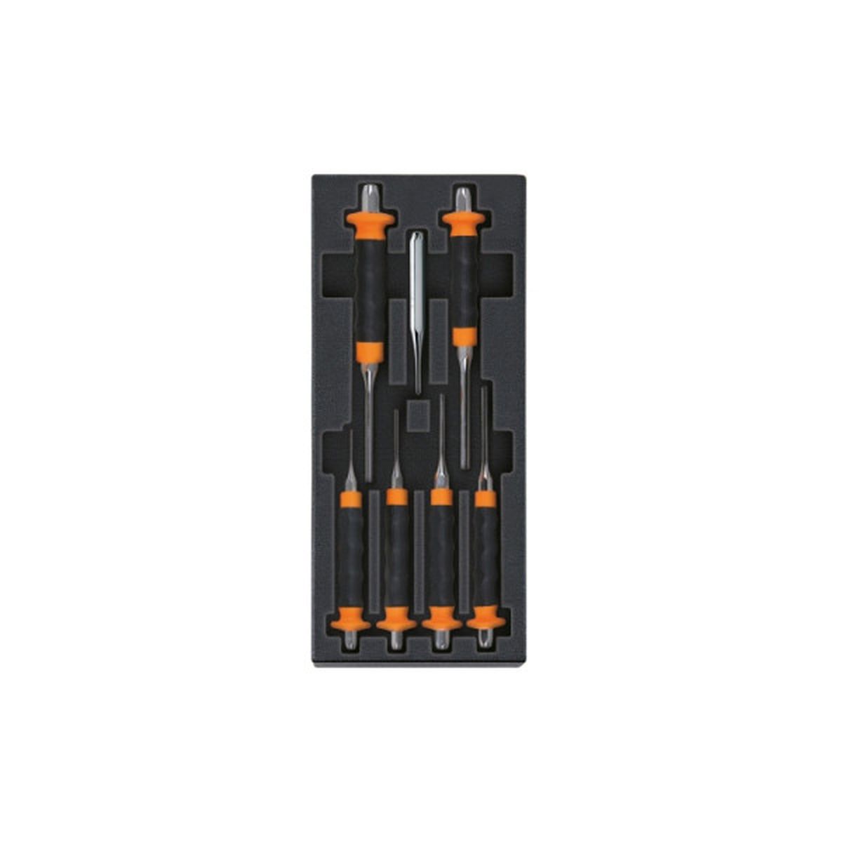 De Beta T239 – 7 Delige Gereedschap Inlay bevat zes uitdrijvers en een centerpunt, overzichtelijk gepresenteerd in een duurzame inlay. Ideaal voor precisiewerk en handig georganiseerd in elke werkplaats of gereedschapslade. Een praktische set voor elke technische gebruiker.