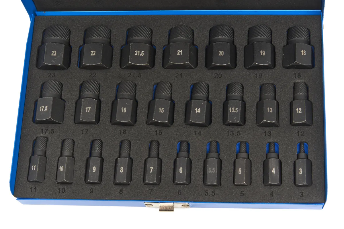 Deze HBM multi-spline schroefextractorset is ideaal voor het verwijderen van gebroken tapeinden, bouten, inbusbouten en fittingen. Deze verwijderingsset is gemaakt van hoogwaardig staal en is dus erg sterk en duurzaam. De innovatieve spiraalprofiel bijt zich als het ware vast in de schroefkop en zorgt ervoor dat de schroef veilig kan worden losgemaakt. De schroefextractorset wordt geleverd in een stevige koffer voor gemakkelijk transport en opslag.