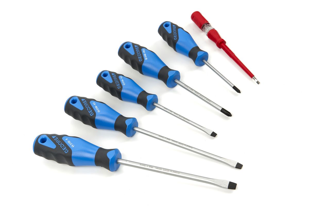 Fasetester volledig geisoleerd volgens DIN VDE 0680-6. 3-componenten-greep Power-Grip3 met ophanggat. Handvat met ergonomisch design voor nauwkeurig en moeiteloos werken. Vormsluitende verbinding van greep en kling voor optimale krachtoverbrenging. Schroevendraaierkling van GEDORE-molybdeen-vanadium-staal getemperd. Einde van de greep met markering van het schroefkop-type en de grootte. Schroevendraaiers met 3-componenten-grepen, liggen goed in de hand. De spanningzoeker in de set is VDE gekeurd.