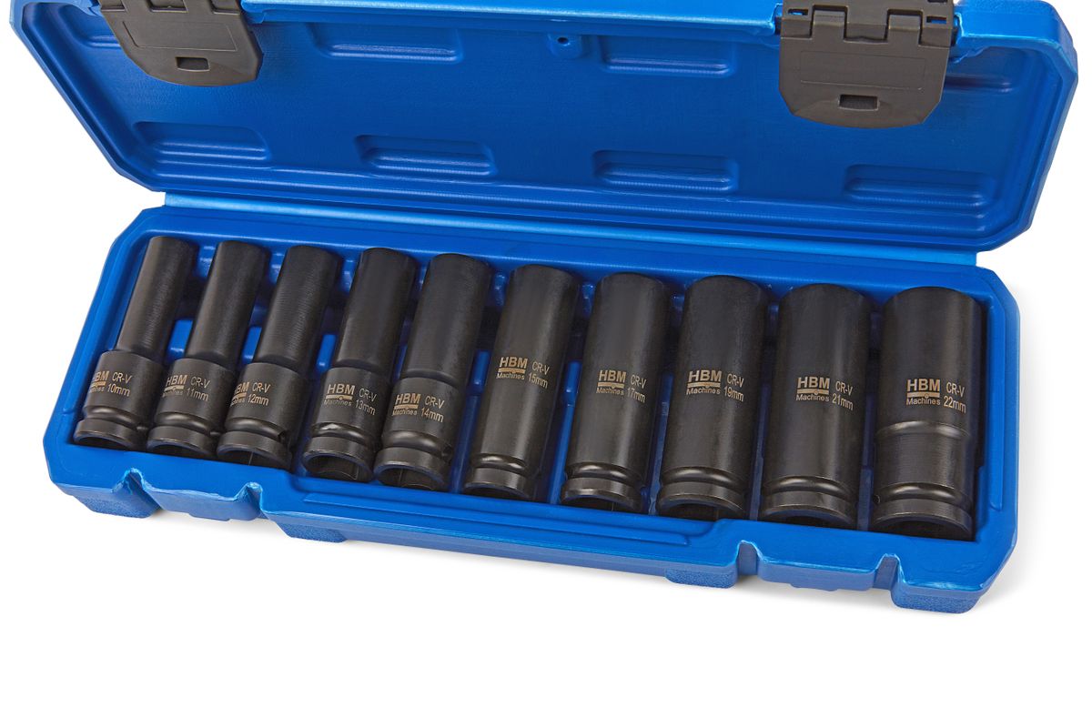 Diepe, zeskantige dop specifiek gesmeed voor het gebruik met slaggereedschap. Precisie koud gesmeed en gehard chroom vanadiumstaal. Duidelijk afleesbaar, laser gegraveerd maten en industriële fosfaat coating voor effectief bescherming tegen corrosie. Dikwandige ontwerp zorgt voor stabiliteit en duurzaamheid voor herhaalde hoge koppels. Gat in de zijwand voor bevestiging aan het gereedschap via kogelafsluitingsmechanisme of grendelpen.