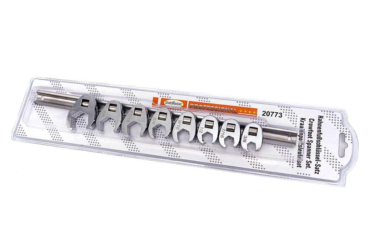 Je bevestigt bouten en moeren een stuk sneller met deze Stahlkaiser 8 Delige Kraaienpootsleutels INCH Met 3/8” Opname. Moeren aandraaien, zelfs op moeilijk bereikbare plaatsen, wordt een stuk makkelijker dankzij deze compleet uitgeruste set. Met deze kraaienpootsleutels draai je bouten en moeren goed vast, daar waar een gewone ringsleutel niet werkt. Je herpakt de bout of de moer ook snel dankzij het slimme design van de sleutel.
