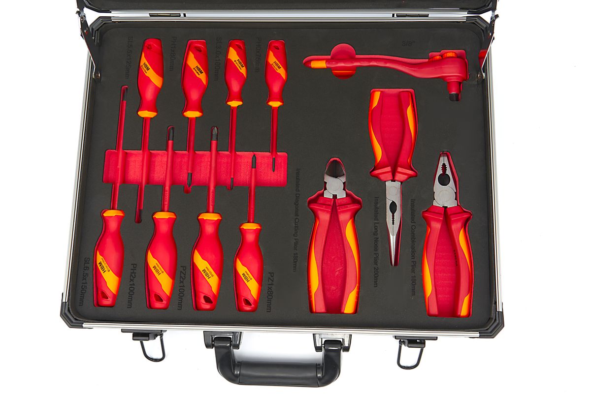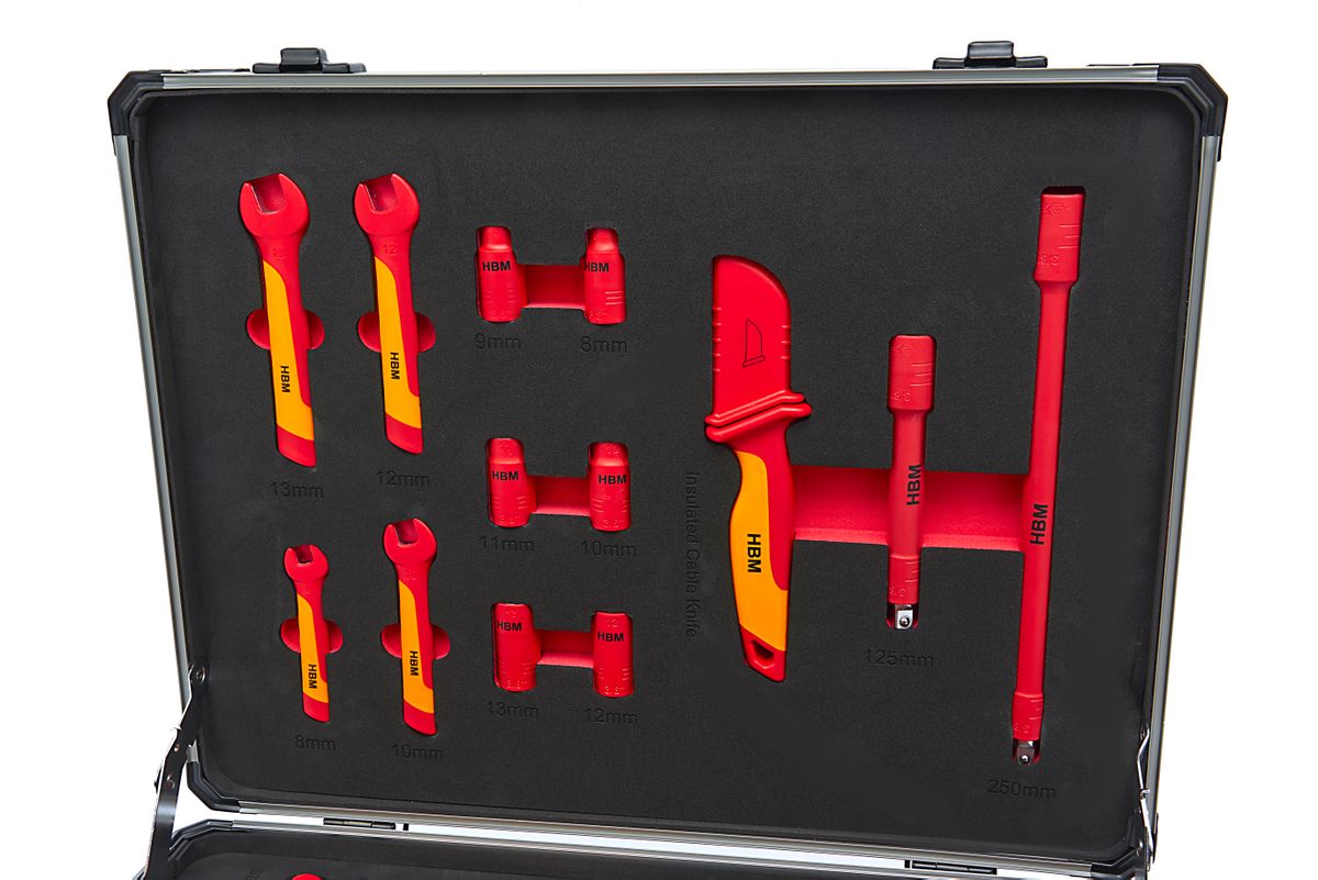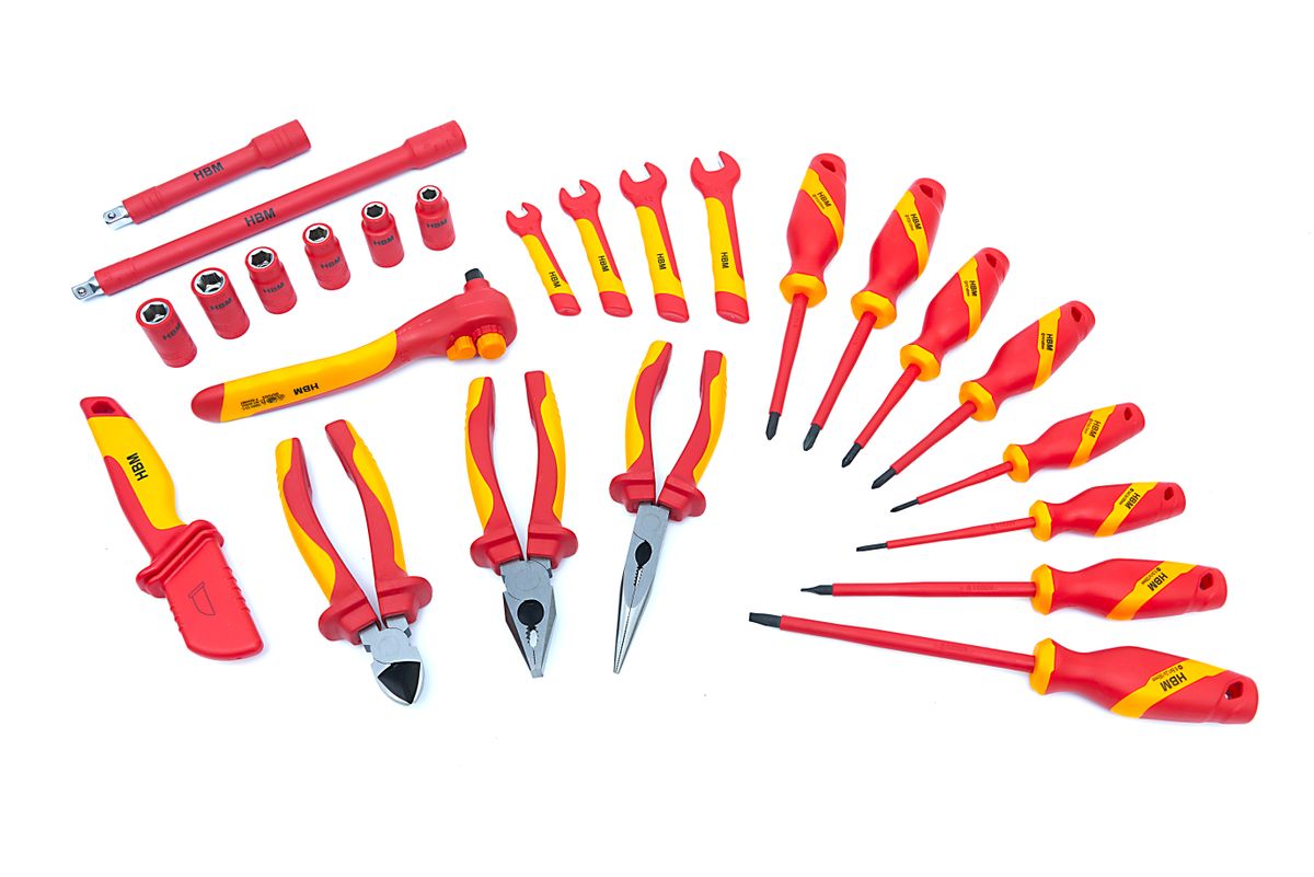 Ontdek de veelzijdigheid van de HBM 25-delige VDE gereedschapset, een onmisbare verzameling voor professionals en hobbyisten. Deze set bevat een scala aan geïsoleerd gereedschap, waaronder combinatietangen, lange neustangen, zijsnijtangen, schroevendraaiers met sleuf- en kruiskop, Pozidriv schroevendraaiers, open ringsleutels, een kabelmes, een ratelsleutel en een assortiment zeskantige doppen. Al het gereedschap is vervaardigd van duurzaam chroom-vanadium staal en biedt betrouwbaarheid en veiligheid bij elke klus. Met deze set ben je altijd goed uitgerust voor allerlei werkzaamheden.