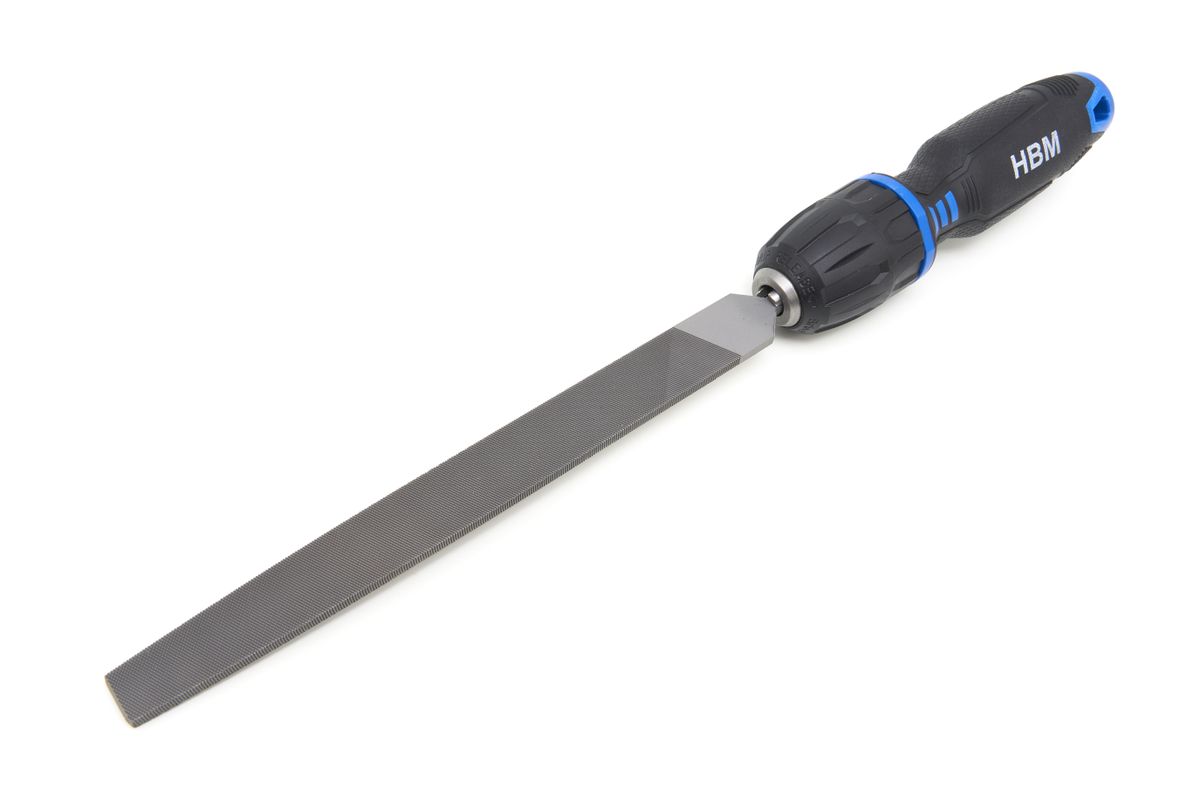 HBM Vijlenset, 19 Delig. Werkplaatsvijlen van hoogwaardig koolstofstaal (C>1,3%), optimale hardheid (62 – 63 HRC), dubbel gekapt en lange standtijd. Stevige 2-componenten antislipgrepen. De set bestaat uit een 200 mm. vlakstompe, halfronde, ronde, en driehoek en vijl, 150 mm. half rond met conische punt, rond, kruis, baret, driehoek, vierkant met conische punt, plat, conisch plat, ronde rand met conische punt. Ook zitten er 2 schroevendraaier opzetstukken van elk 150 mm bij, plat en kruis
