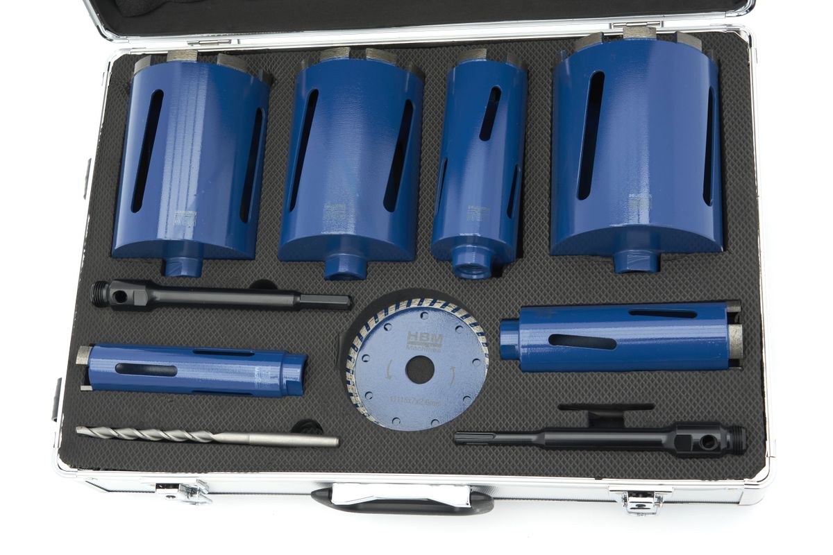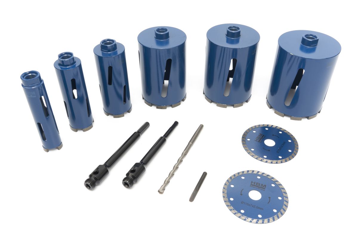 Deze HBM kernboren set bevat alles wat je nodig hebt voor het droog boren in harde materialen zoals beton, baksteen en natuursteen. De set bestaat uit zes diamant gecoate kernboren in verschillende diameters, twee diamantschijven, adapters voor aansluiting op je boormachine, een centreerboor en een uitslagpen voor eenvoudig verwijderen van toebehoren. Geleverd in een stevige opbergkoffer. Ideaal voor installatie- en renovatiewerk.