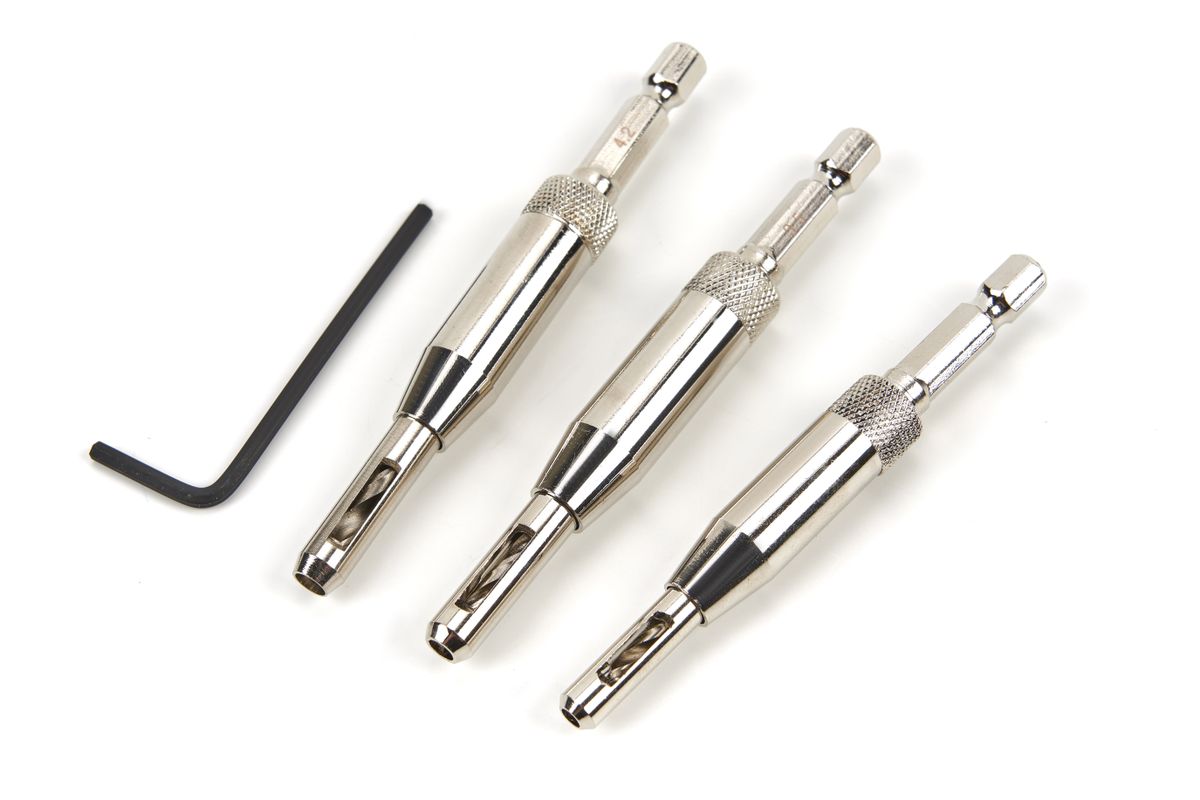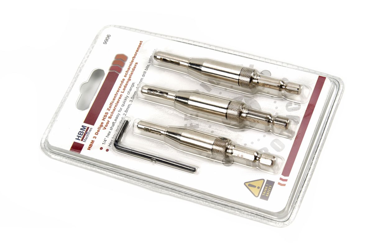 De HSS boren zijn voorzien van een veerkraag, geschikt voor het positioneren van deurscharnieren. Gebruik het scharnier als mal en boor door de soeverein scharniergaten. Maten: 2,8 – 3,5 en 4,2 mm. Opname: HEX.