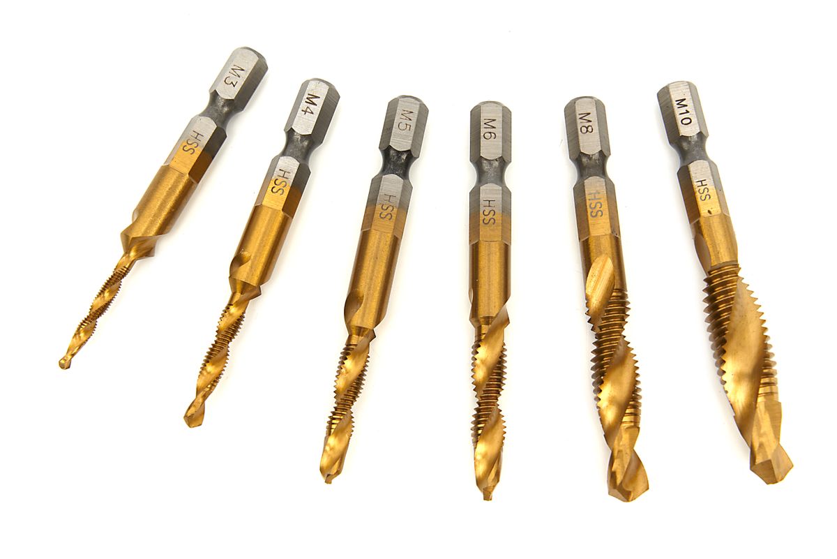 Met HBM 6 Delige HSS Zelftappende Borenset M3 tot M10 gecombineerde boor / tap kunt u een gat boren en tegelijkertijd een draad afsnijden. Boor tap en verzinken bitset, geschikt voor boorhouder of direct in de boorkop. Gekamde boren met gehard stalen boren geschikt voor metalen en kunststoffen.