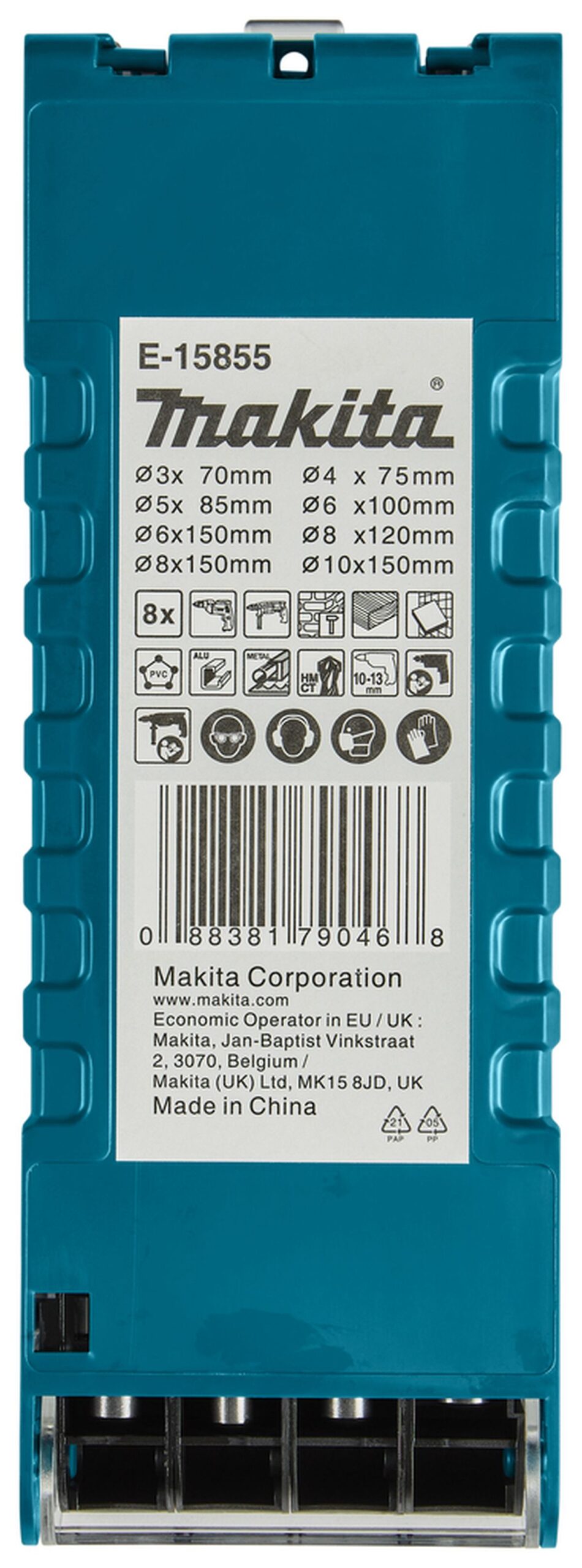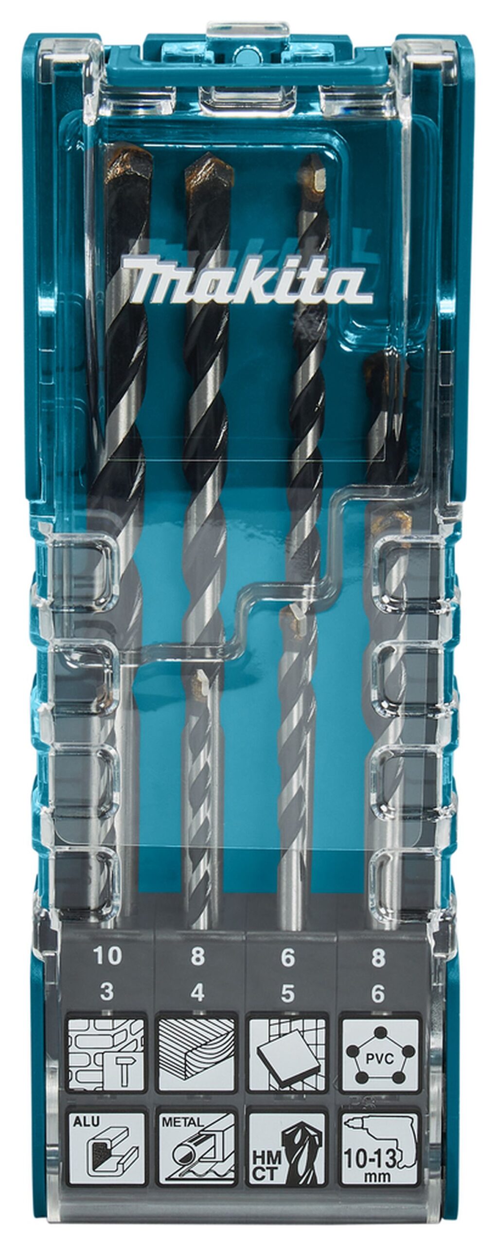 8-delige Makita multiborenset met cilindrische aansluiting, geschikt voor diverse materialen zoals hout, kunststoffen, baksteen, gipsplaat, keramische tegels, kalkzandsteen, aluminium en staal. Deze set bevat boren in de afmetingen: 3×70 – 4×75 – 5×85 – 6×100 – 6×150 – 8×120 – 8×150 – 10x150mm. In handige kunststof waaier-cassette.