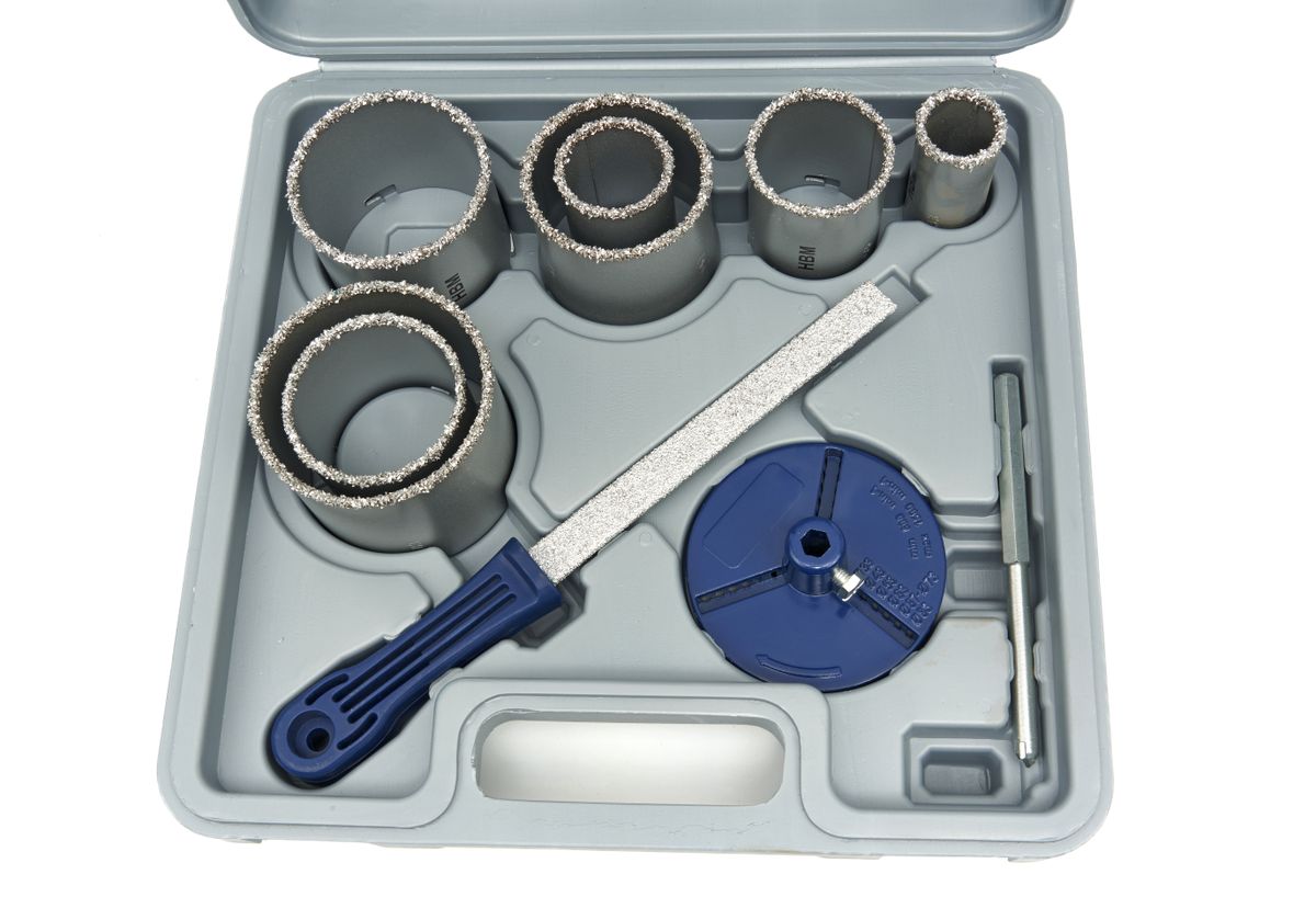 De HBM 10 Delige Diamant Gatzagenset voor Steen is uitermate geschikt om te zagen in zachte steensoorten zoals bakstenen.. De set bestaat uit een vijftal gatzagen in de maten 33,43,53,63,67,73 en 83mm De gatzagen zijn voorzien van een variabele tandsteek. Daarnaast bevat deze set een vijl, een boorhouder en een steenboor