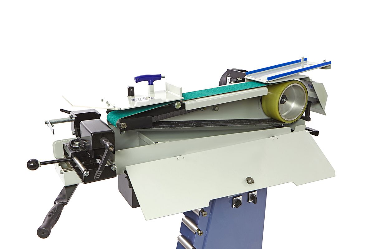 De machine heeft 3 bedienvlakken: vooraan voor buizen (met buizenklem), bovenaan voor vlakslijpen en achteraan voor rondslijpen (met werkstuksteun) Buisuitslijper: voor diverse metalen buizen en profielen Hoekinstelling buizenklem van 30 tot 90° Eenvoudige klemming en efficiënte werking met hefboomhendel. Prismabek met aanslag, instelbaar zonder sleutels. Sterke motor met 2 snelheden voor verwerken van zowel staal als inox. Snel wisselen van draairichting en snelheid met keuzeschakelaars. Kan aangesloten worden op een stofafzuiging dankzij de afzuigmonden. Gemakkelijke wissel van de schuurband en slijprollen. Veiligheden: Voorzien van een aparte noodstop en afzonderlijke start / stopknop Nullastspanning Wegklapbare veiligheidsafscherming. Geschikt voor: Buizen en klassieke slijpwerkzaamheden. Ateliers met beperkte ruimtes Werkplaatsen, onderhoudsdiensten, scholen en opleidingcentra.