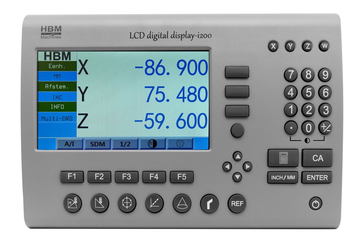 Deze HBM “Digital Read Out” (DRO) met kleuren LCD scherm is de moderne versie van de bekende Sino LED DRO uitleesapparaten. Deze fraaie digitale uitleeskast is geschikt voor zowel draaien als frezen en biedt simultane uitlezing van 3 assen in zowel mm als inch.De unit is compatibel met de oude SINO glaslinialen (en natuurlijk ook met de nieuwe HBM glaslinialen). Het is dus mogelijk om je oude Sino LED DRO te vervangen door deze LCD DRO zonder je linialen te hoeven vervangen (dat scheelt dus veel werk). De LCD uitlees unit heeft een nauwkeurigheid van +/- 0.005 mm of 0.002 inch. De behuizing van de uitleeskast is gemaakt van slagvast PE. Aan de achterzijde bevinden zich de aansluitingen voor de glaslinialen (9 polige D-Sub connectoren). De USB uitgang aan de achterzijde is momenteel nog ongebruikt. Deze digitale uitlees units met kleuren LCD scherm hebben niet alleen een luxe uitstraling, maar zijn ook zeer prettig om mee te werken vanwege de grafische weergave van iedere functie en de fijne rubberen knoppen waarmee gemakkelijk door de grafische gebruikersinterface kan worden genavigeerd.Wat is het verschil tussen de LCD en de oudere LED uitleeskasten?De LCD versie met haar kleurenscherm en grafische gebruikers interface is meer van deze tijd en is laagdrempeliger dan de voormalige LED versie. Zo biedt de LCD uitleeskast meer informatie en feedback tijdens het invoeren van parameters, terwijl men met de vier pijltjes toetsen gemakkelijk kan navigeren naar een volgend invoerveld. Ook de volgorde van invoer is bij de LCD DRO niet zo strikt meer als bij de LED versie. Dit maakt het eenvoudiger om de complexe functies (punten op een cirkelboog bijvoorbeeld) te gebruiken, die om deze reden vaak ongebruikt bleven bij de gebruikers van de LED versie. De mogelijkheden van beide systemen zijn inhoudelijk echter nagenoeg gelijk. Bij de LED versie is er (bijna) geen sprake van weergave van letters en dus is daar een taalinstelling achterwege gelaten. Overige verschillen betreffen vooral ook de hardware kant. Zo hebben de LCD uitleeskasten echte fysiek uitgevoerde rubberen drukknoppen, terwijl de LED versies de bekende membraan-folie frontpanelen hebben. Dit maakt het werken met deze LCD uitleeskasten in haptische zin veel gebruikersvriendelijker en dus een prettiger ervaring.