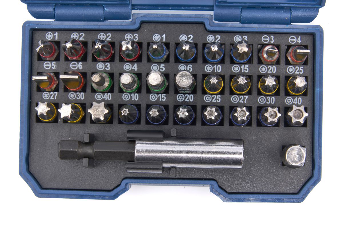 • 30 bits: 6 mm PH1, PH2, PH2, PH3, PZ1, PZ2, PZ2, PZ3, SL3, SL4, SL5, SL6, H3, H4, H5, H6, T10, T15, T20, T25, T27, T30, T40, TT10, TT15, TT20, TT25, TT27, TT30, TT40 (chroom vanadium)