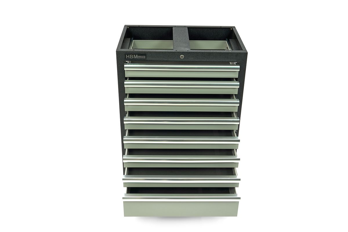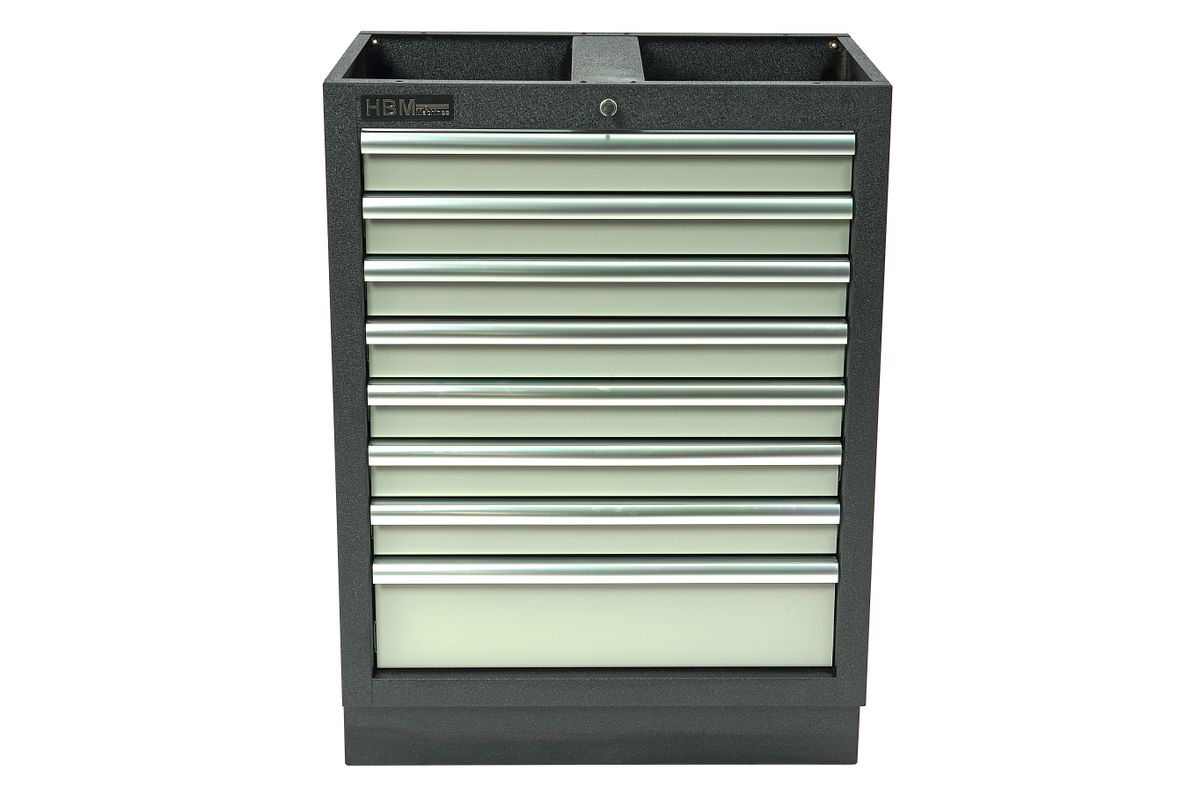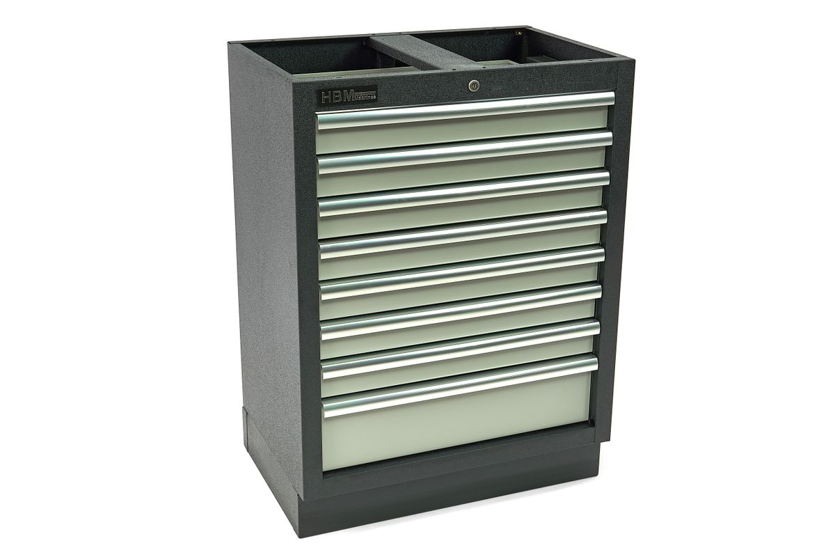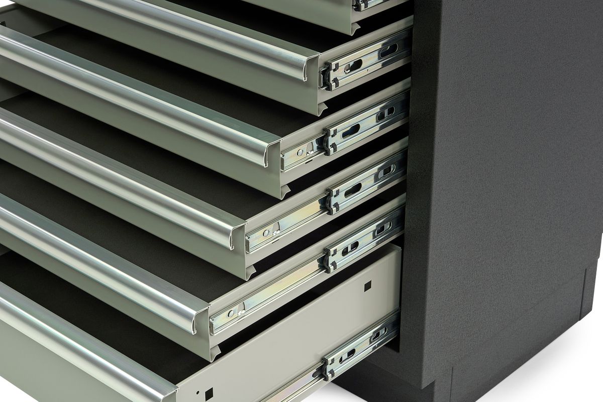 Je werkplaats overzichtelijk inrichten is van groot belang om kleine en grote klussen goed uit te voeren. Of je nu een enthousiaste hobbyist bent of een serieuze professional. Met deze gereedschapskast met acht lades beschik je over ruim voldoende plaats voor het opbergen van allerhande gereedschap. Zowel het functionele design als de professionele look van de kast dragen bij aan de inrichting van elk soort werkplaats. Daarbij beveilig je je tools door middel van een dubbel slot. Door middel van acht ruime lades richt je je werkplaats met deze gereedschapskast efficiënt in. De stevige structuur maakt het de ideale opbergplaats voor kostbaar gereedschap. Evengoed kun je hem dankzij het compacte ontwerp vrijwel overal kwijt. Solide kogelgelagerde geleiders in de lades maken het gebruik van deze kast ook bijzonder prettig. Alle lades beschikken over handvatten over de gehele breedte, waardoor je ze gemakkelijker opent en sluit.