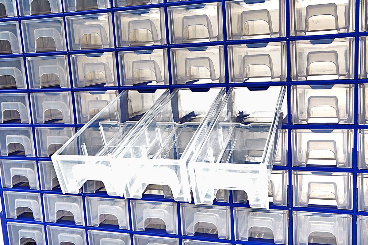 Alles in een oogopslag, alles mooi gescheiden: het veelzijdige magazijn voor kleine onderdelen zorgt voor orde met een systeem. De 64 transparante schuifvakken zijn ideaal geschikt als bewaarplaats voor schroeven, onderdelen, Lego, juwelen en nog veel meer. De flexibele modules kunnen volledig verwijderd worden. Indien nodig kan het aantal vakken door scheidingsplanken tot het 4 voudige verhoogd worden. De twee ophangmogelijkheden van het stabiele kunststofframe garandeert stevigheid aan de wand bij een volle lading. Geen wirwar, geen moeizaam zoeken meer met het praktische magazijn voor kleine onderdelen. Losse tussen schotten zijn niet te verkrijgen. Overige specificaties Voorzien van uitsparingen voor wandmontage aan de achterzijde Alle laden zijn voorzien van 1 verstelbare vakverdeler