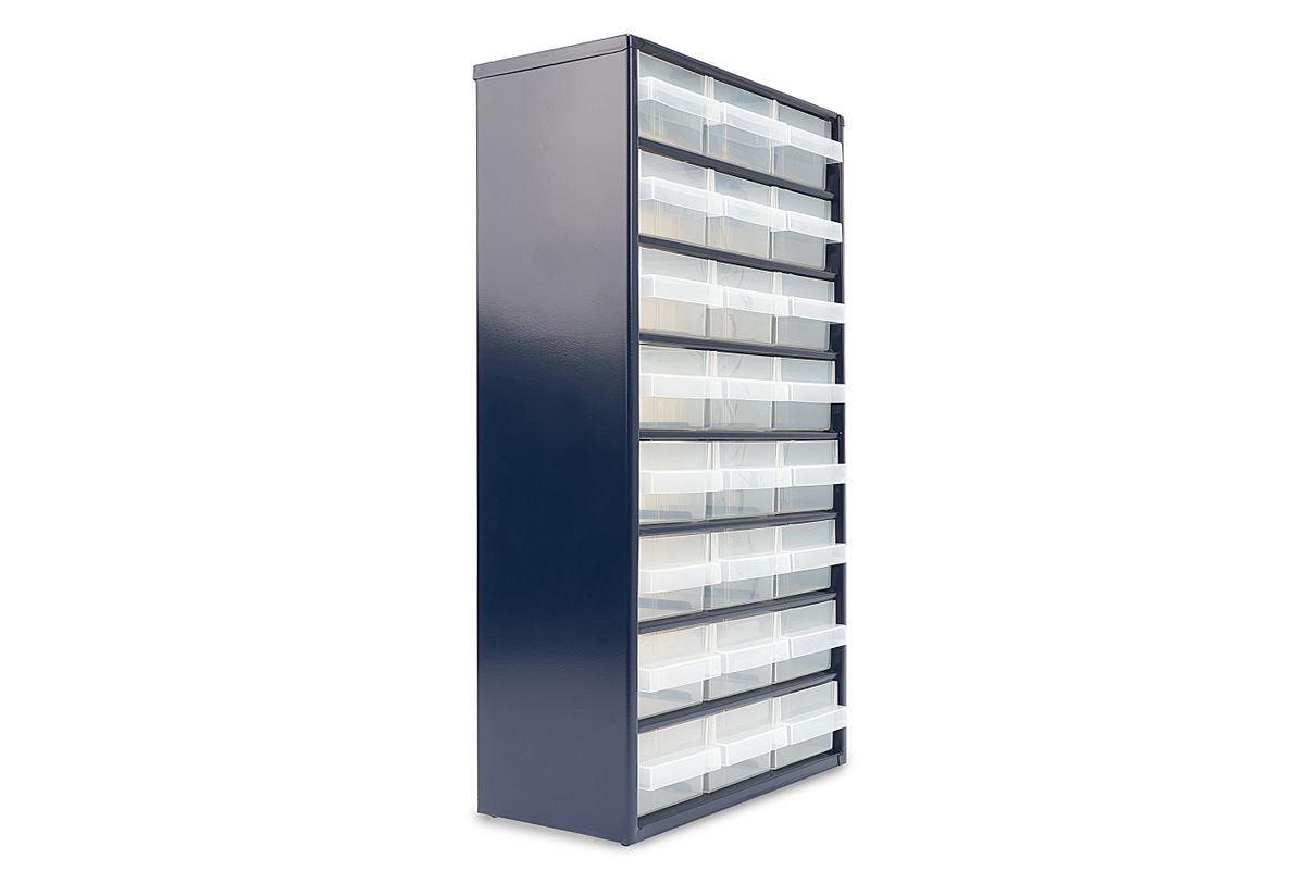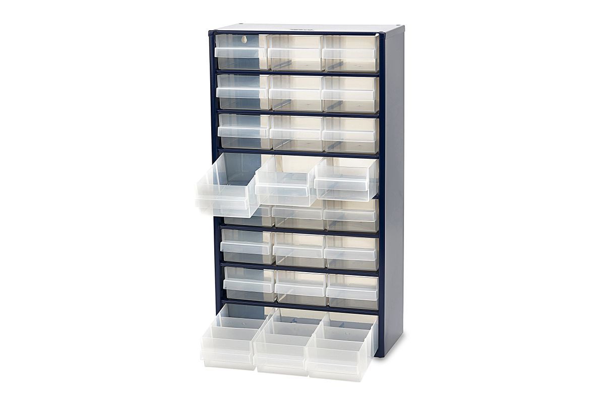 Ladenkast van Raaco, wordt geleverd inclusief 24 transparante laden van het type 150-02. Elke lade kan in 3 vakken worden verdeeld. De ladenkast is gemaakt van staal, de laden van polypropyleen (PP). Raaco Systeem 150 ladekast, (hxbxd) 552x306x150mm, 24 laden, ladeverdeling (h x b) 8×3, corpus staal, corpus blauw, lade kunststof, lade transparant.