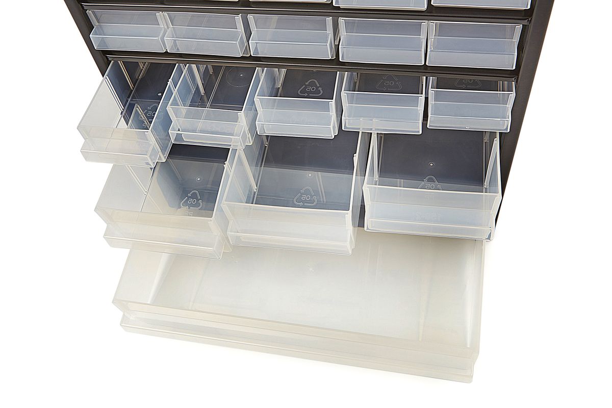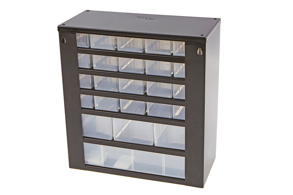 Stevige metalen ladekast van Raaco met 24 slagvaste polypropyleen laden. De lades kun je verdelen met de 10 meegeleverde tussenschotjes. De ladebakjes zijn transparant zodat je in een oogopslag ziet wat er in zit. De ladekast is geschikt voor muurbevestiging en is eenvoudig te monteren aan de wand. Ideaal voor in de werkplaats of hobbyruimte voor het opbergen van kleinere materialen zoals schroeven, pluggen en spijkers.