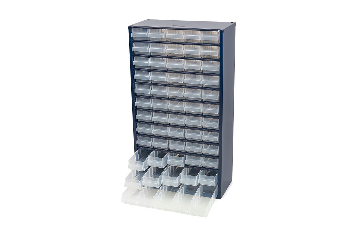 Stevige metalen ladekast van Raaco met 60 polypropyleen laden. Er worden 10 tussenschotten meegeleverd zodat je enkele laatjes naar wens kunt indelen. De lades kun je in maximaal 4 vakken verdelen. De ladebakjes zijn transparant zodat je in een oogopslag ziet wat er in zit. De ladekast is geschikt voor muurbevestiging en is eenvoudig te monteren aan de wand. Ideaal voor in de werkplaats of hobbyruimte voor het opbergen van kleinere materialen zoals schroeven, pluggen en spijkers.
