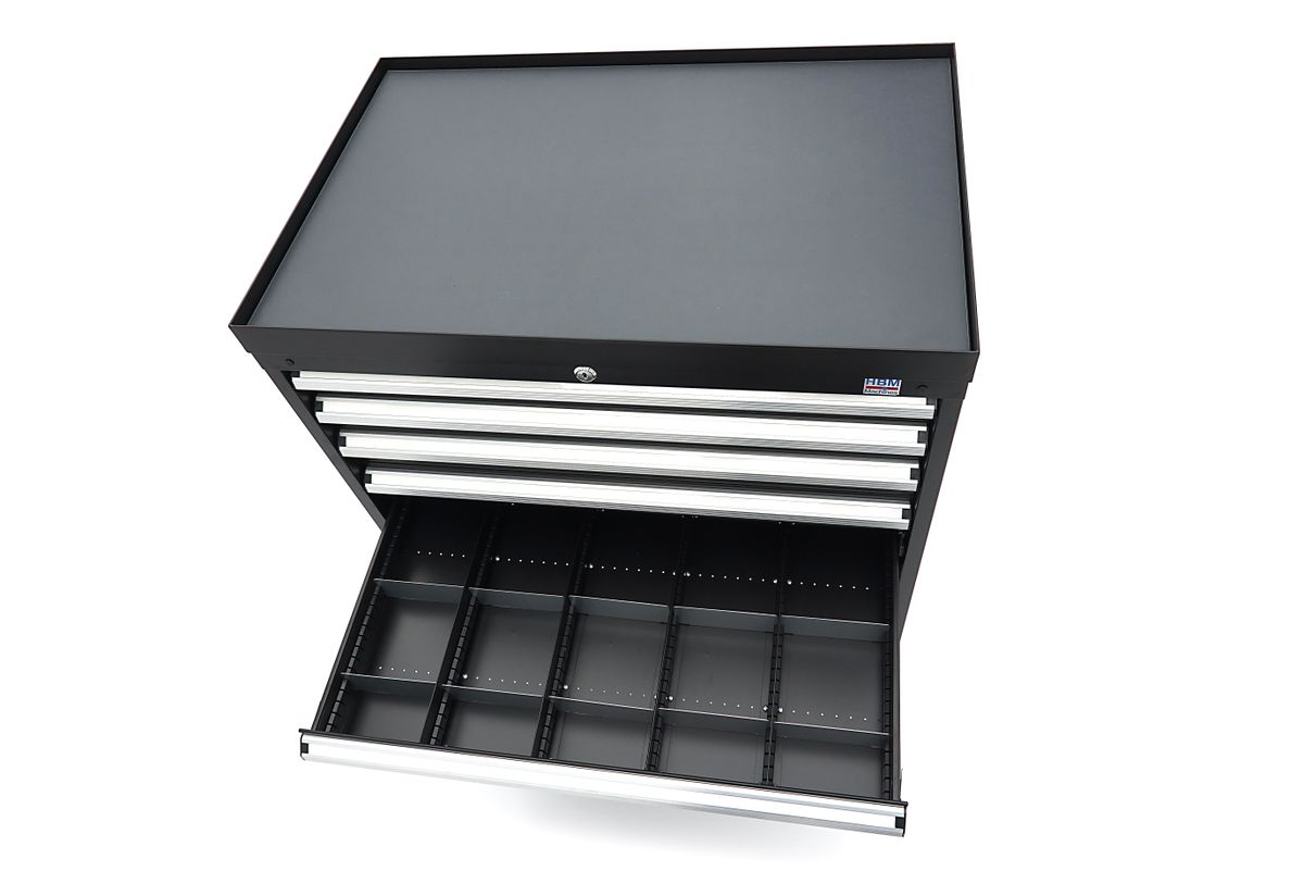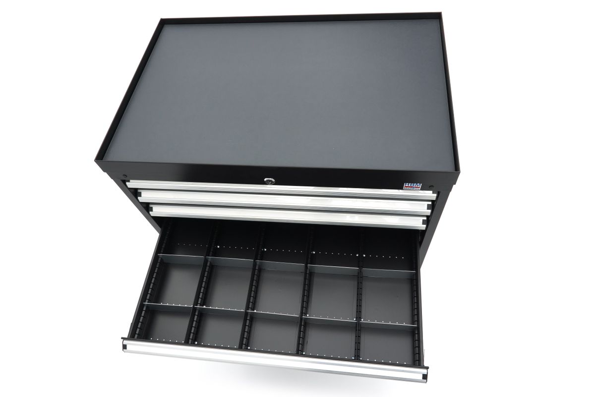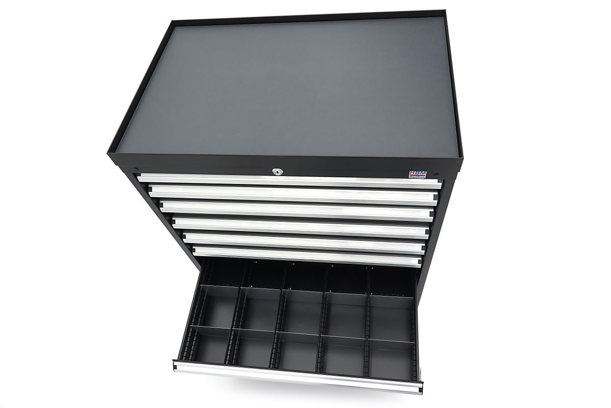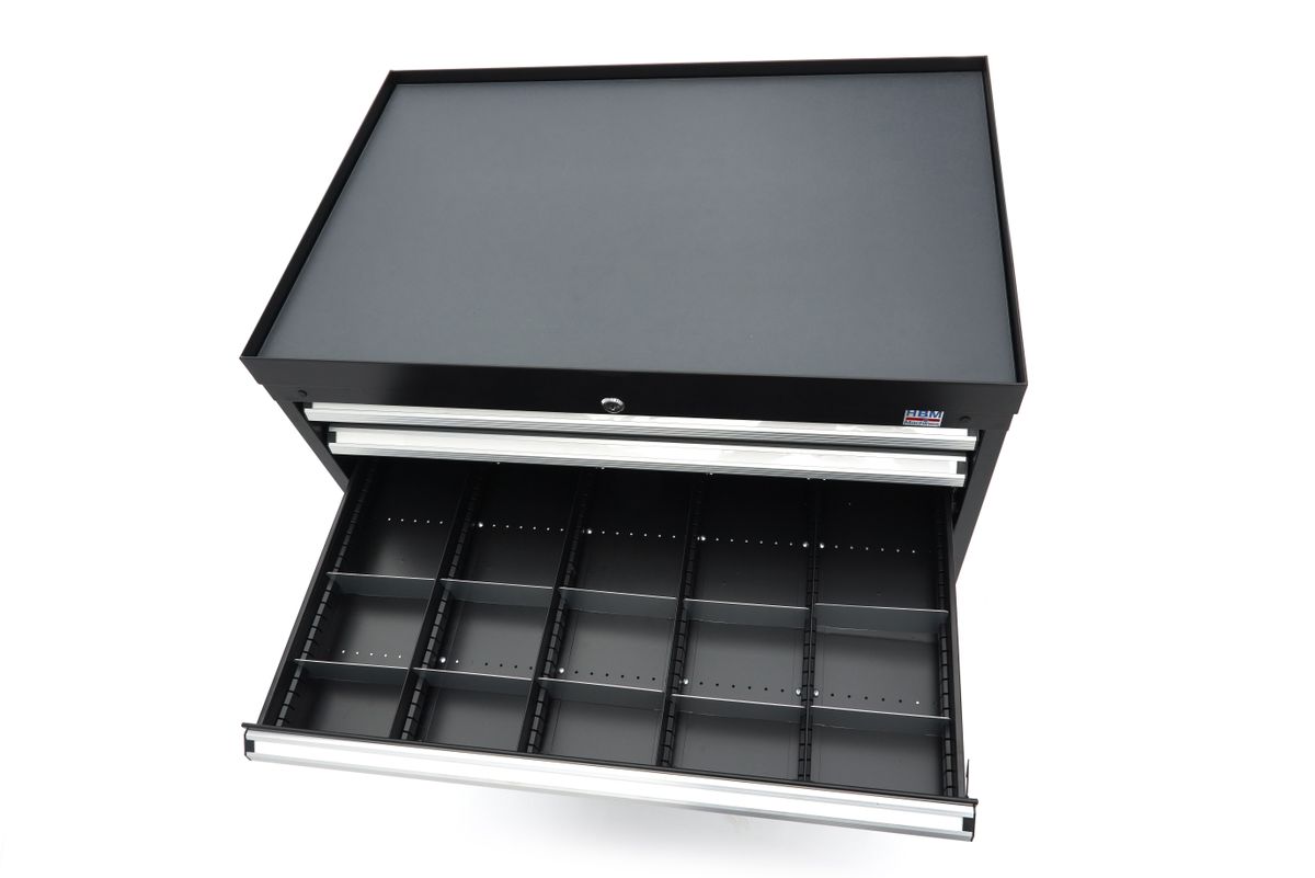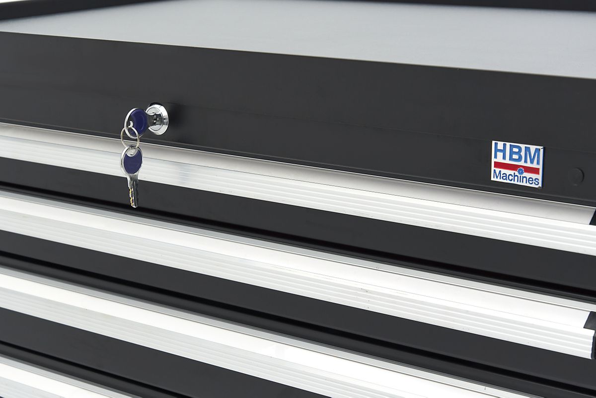 Met deze HBM gereedschapskast met bakjes en tussenschotten haal je topkwaliteit in huis. De kast wordt zowel ingezet in mechanische als elektronische werkplaatsen en voor gereedschappen en kleine onderdelen. Door de stevige uitvoering kan de kast ook tegen een stootje. Alle laden zijn voorzien van een lift-up slot. Daarnaast heeft de kast een centraal slot, waarmee aan het eind van de dag alle laden worden afgesloten. De gereedschapskast heeft een werkblad met opstaande rand.