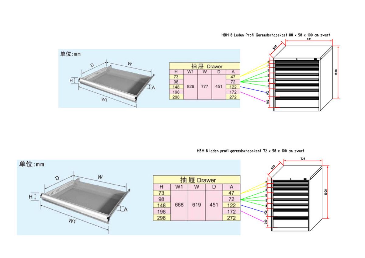 • Gereedschapskast werkblad 40 bakjes 75 x75 mm 20 bakjes 75 x 150 mm 10 bakjes 150 x 150 mm 24 gleufschotten 60 tussenschotten 2 sleutels
