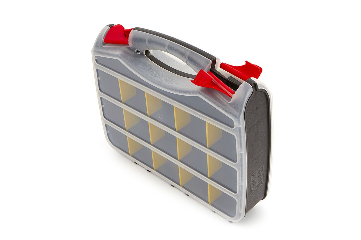 Dubbelzijdige assortimentskoffer met transparante deksel van sterke en duurzame kwaliteit. Door middel van losse schotjes is de vakverdeling zelf zeer eenvoudig aan te passen.