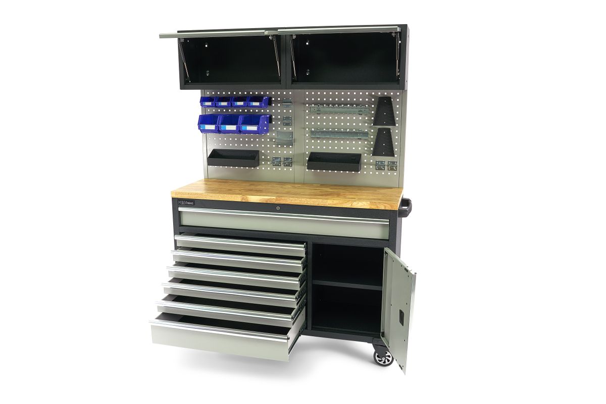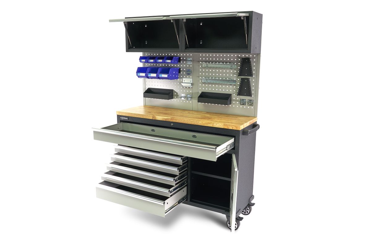 Deze verrijdbare werkbank met robuust design is de perfecte uitbreiding voor grote werkplaatsen. Denk aan garages, werkplaatsen en dergelijke. De bokwielen onder de werkbank zorgen voor extra beweeglijkheid, waardoor je het systeem zonder problemen verplaatst. Elk van de lades in deze kast is voorzien van kogelgelagerde geleiders. Hierdoor gaan ze erg gemakkelijk open en dicht. Ook zorgen antislipmatten ervoor dat tools en materialen niet zomaar gaan schuiven. Zelfs als je de bank vervoert over een oneffen ondergrond. Tenslotte is de bank uitgerust met vier stootstrippen op de hoeken, als bescherming tegen stoten.